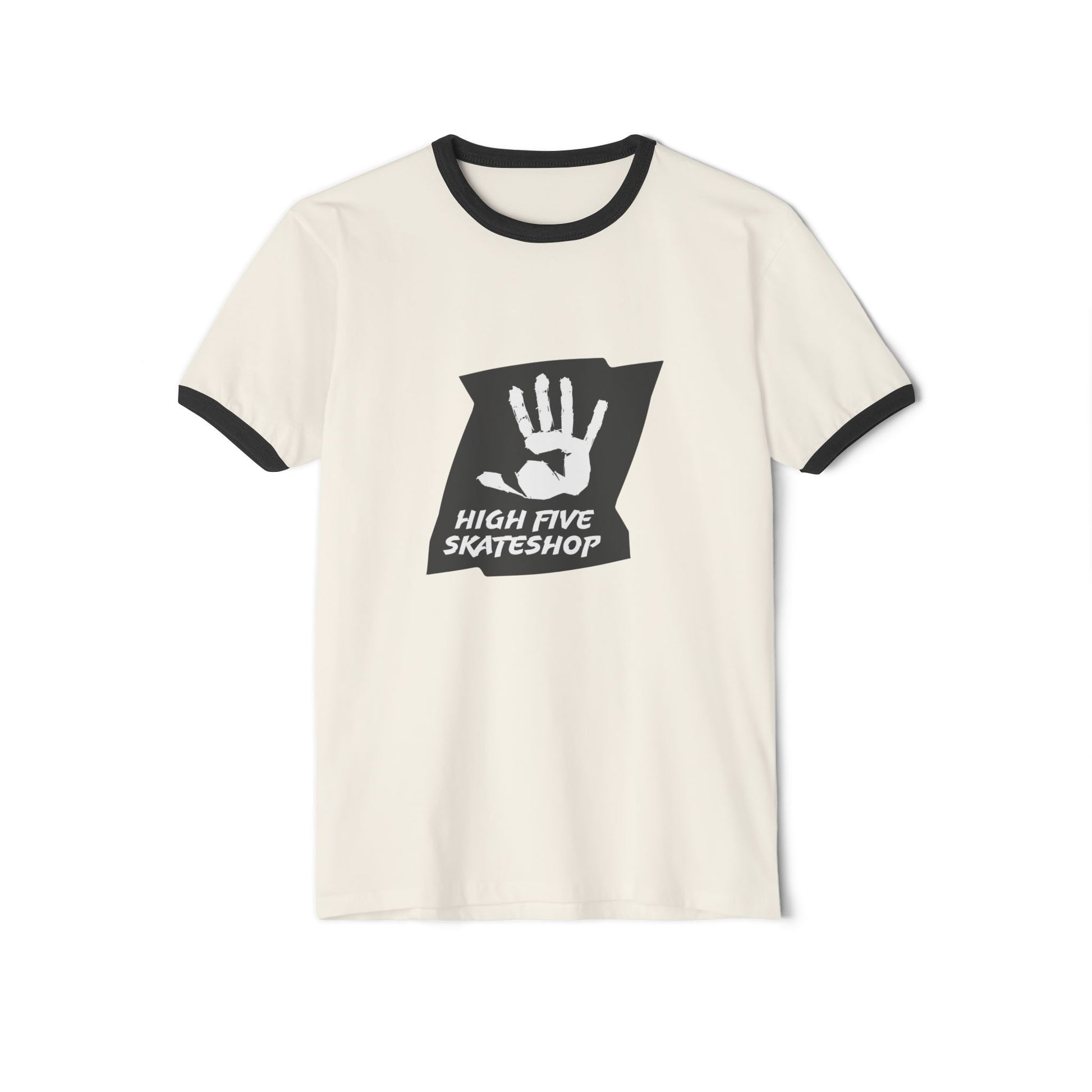 Unisex Skate Shop Ringer T-Shirt — "High Five Skateshop" Vintage Handprint Tee