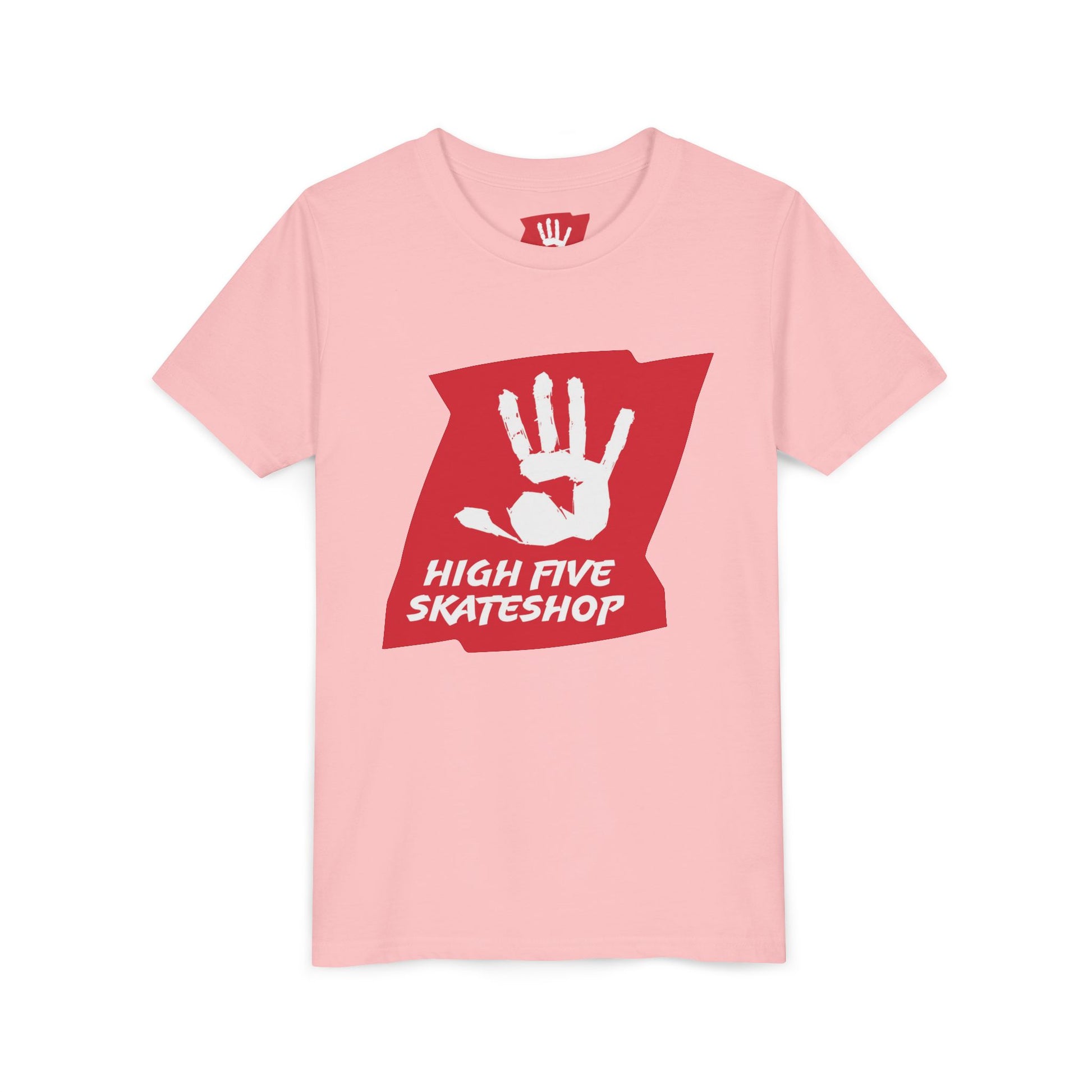 This soft, lightweight youth tee brings skatepark energy to everyday play. The bold handprint logo in bright red reads loud and proud: High Five Skateshop — a simple, graphic statement that pairs well with jeans, hoodies, and scraped-knee stories. Breathable airlume-combed cotton keeps kids cool while the retail fit and crew neckline give a tidy, modern silhouette. Durable construction details — shoulder tape, side seams, and a ribbed collar — mean it stands up to repeated wear and washes. The tear-away DTF neck label stays comfortable against the skin, so the shirt keeps the focus on fun rather than fuss.